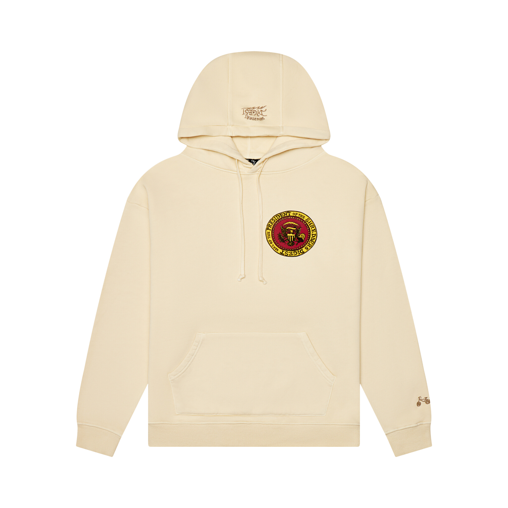 Hand printed on our terry cloth embroidered hoodie. Magic Moto back print and Presidential Seal of Shredders front print